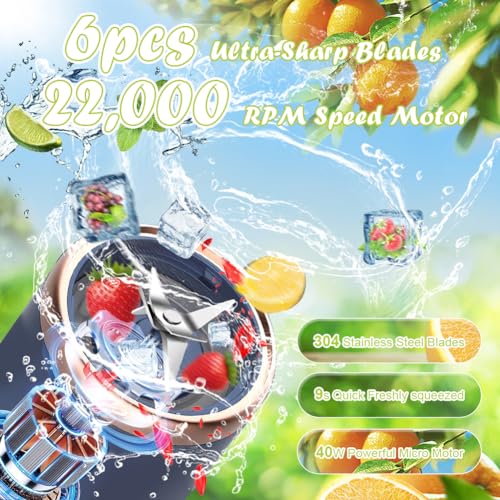 - Upgraded 6 Blades The Zinueen smoothie blender is equipped with 6 sharp 304 stainless steel blades and a 40W high-performance copper motor that reaches 21,000 revolutions per minute to ensure even mixing and fast results, which can easily chop ice and frozen fruits, and a fast rotation of about 30 seconds for finer shakes and smoothies.