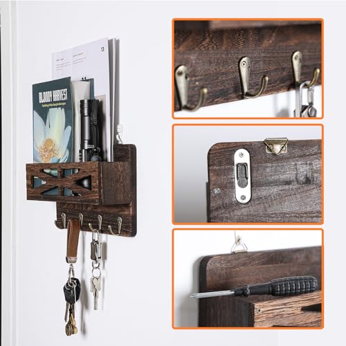Zisoue - Key Holder for Wall, Key Hooks for Wall with Mail Organizer, Wooden Key Rack Organizer with 4 Hooks, Key Holder Wall Mount for Bags, Coats, Umbrella, Dog Leash, Sunglasses, Brown