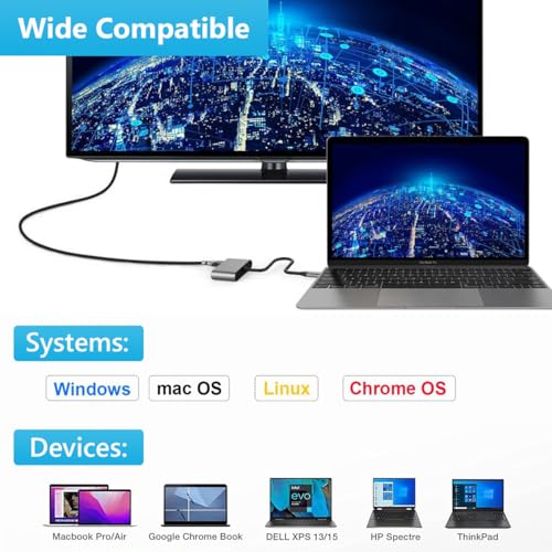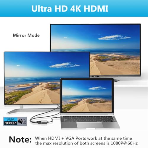 - 【Dual Monitors Display】: USB C VGA HDMI Adapter is designed to mirror or extend the screen of laptop etc USB C devices, HDMI and VGA port work simultaneously; Allow you to connect hdmi/vga port monitors, displays, tvs. ❤(Noted: Under extend mode, two screens ONLY can extend same images, like A-B/B, not 3 same images)
