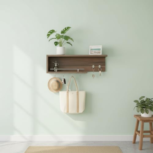 Generic - Zohny Home Wall Mount Organiser with Floating Shelf, Natural Wood, 60x15x15 cm, Rectangular, Minimalist, Key Hooks and Hanging Rod (Brown)