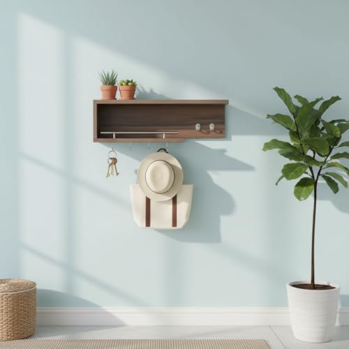 - MULTIFUNCTIONAL DESIGN: Wall-mounted organiser combines a floating display shelf, integrated metal hanging rod, key hooks, and accessory hooks to create a complete storage solution for your entryway, mudroom, or office