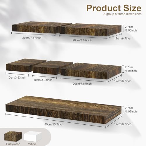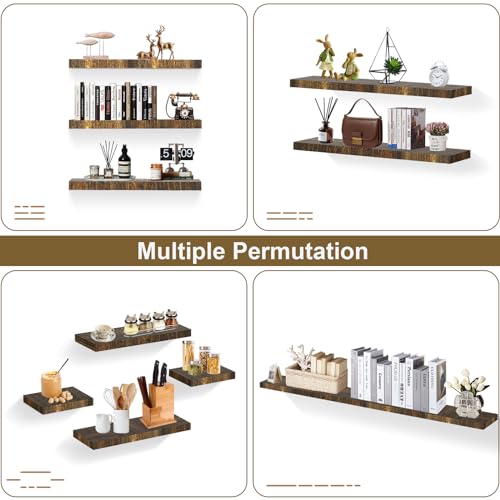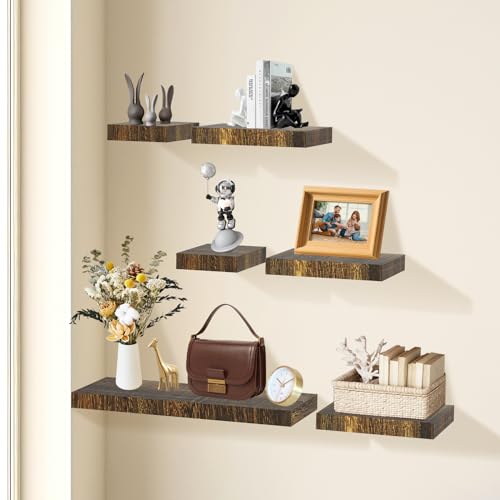 ZONITOK - مجموعة ارفف عائمة تثبت على الحائط من زونيتوك مكونة من 6 قطع، رف معلق مع دعامة غير مرئية، ارفف حائط خشبية ريفية 3 احجام للعرض وغرفة المعيشة والمطبخ والمكتب والمنزل والتخزين والديكور، بني
