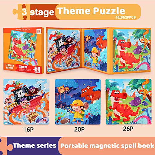ZRCCOX - أحجية مغناطيسية للأطفال من سن 4 و5 و6 و7 و8 سنوات، 3 أحجيات خشبية من 61 قطعة، كتاب أحجيات ديناصور للأطفال الصغار، للبنات والأولاد، ألعاب السفر للأطفال من ZRCCOX