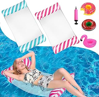 IWTBNOA Pack of 2 Inflatable Water Hammock, 4-in-1 Inflatable Hammock Pool with 1 Air Pump + 3 Drink Holders Pool, Swimming Bed Pool with Net, Lounge Air Mattress Pool for Adults and Children