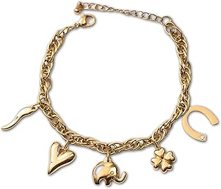 Handcrafted Luck Bracelet - Gold chain bracelet featuring five lucky charms (heart, elephant, four‑leaf clover, horseshoe, key), adjustable length, ideal for daily wear, gifting and layering.