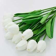 Artificial White Tulips Bouquet, 10 Stems, Realistic Silk Flowers with Green Leaves, 35 cm
