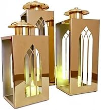 Golden Stainless Steel Lantern Set 3 Pieces Decorative Candle Holders Indoor Outdoor Home Decor Lotus Mirror Design