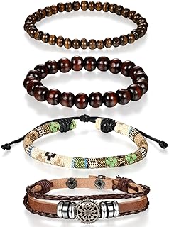 Flongo Men's Women Unisex Vintage Handmade Braided Leather Bead Surf Cuff Bracelet Set, 7 48 inch, alloy, leather, wood, No_Stone