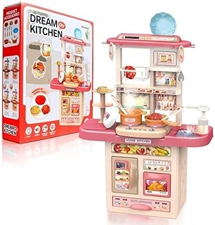 مجموعة لعب دريم كيتشن للاطفال، لعبة مطبخ كبيرة باللون الزهري مع تأثيرات ضوئية وصوتية، ملحقات وتخزين متعددة