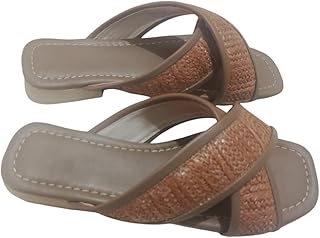 Karisma womens Canvas flat sqaured toe, simple criss cross straps with thin lining strips Slide Sandal
