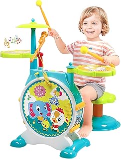 بريتوي! لعبة آلات موسيقية للأطفال مجموعة لعبة طبل كهربائية كبيرة للأطفال ألعاب تعليمية موسيقية، ميكروفون فعال، كرسي مع صوت قابل للتعديل، مجموعة طبول إلكترونية، هدايا عيد ميلاد للأولاد والبنات والأطفال