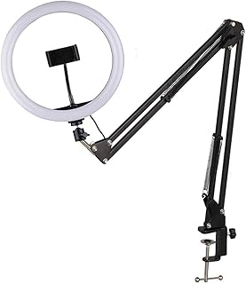 AJH 8 inch LED Selfie Ring Light with Long Arm Clip Phone Holder 3 color Dimmable Ring Light Multi-function Photography for Stream Makeup Photography