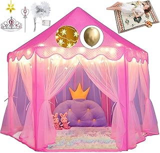 Carenqueen Breathable Tent for Girls Princess Castle - with Star Lights, Tiara and Wand Accessories Tent Set, Portable Children's Tent House for Boys and Girls (Six Doors)